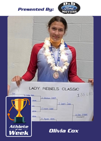 Cox captured the 155-lb weight class championship over the weekend at the Lady Rebels Classic. Cox, a first-year athlete, has stepped into a big role for the Lady Rebels this season.